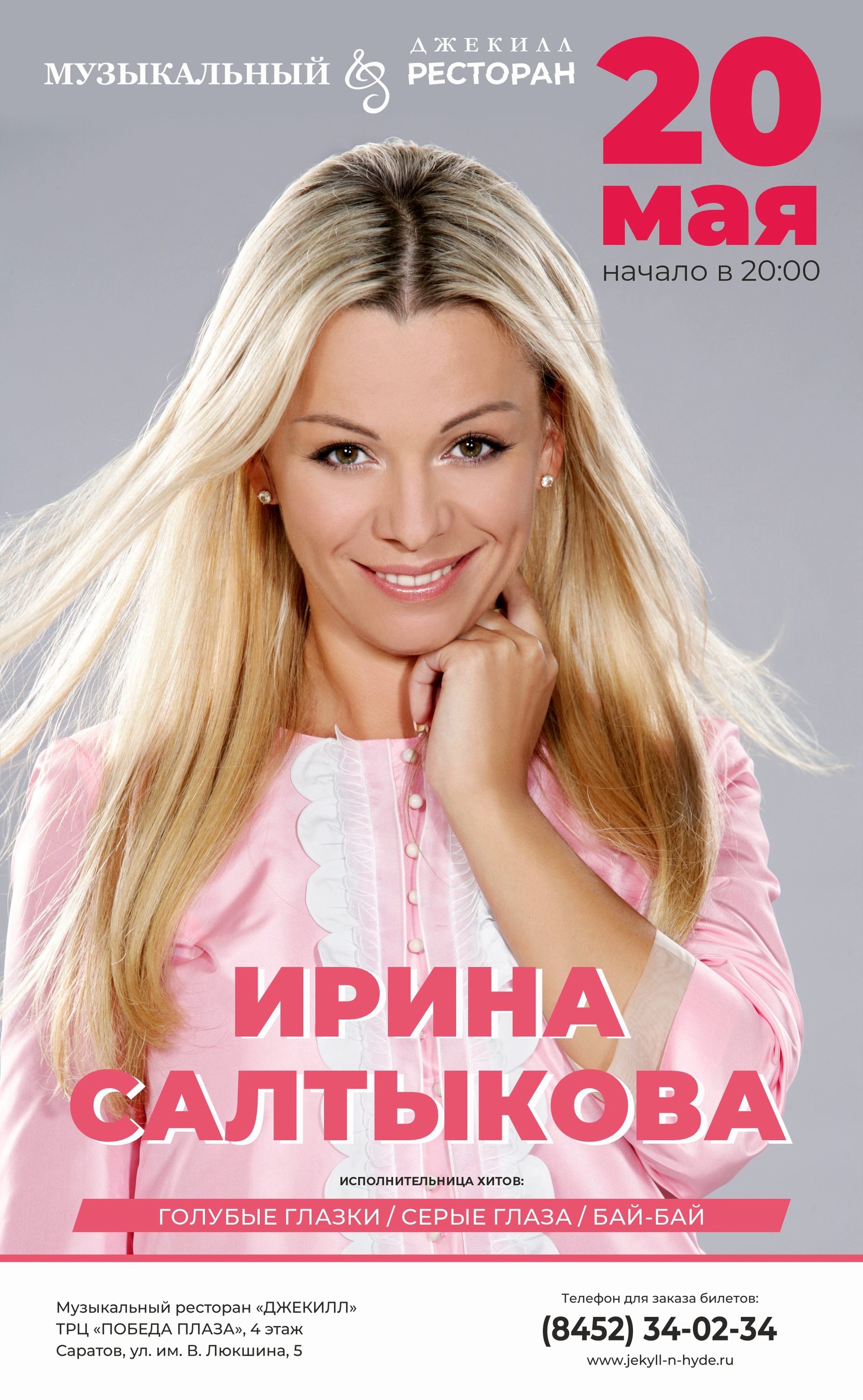 20 мая 2025 года в Саратовском ресторане "Jekyll & hyde" состоится долгожданный концерт Ирины Салтыковой. Не пропустите!